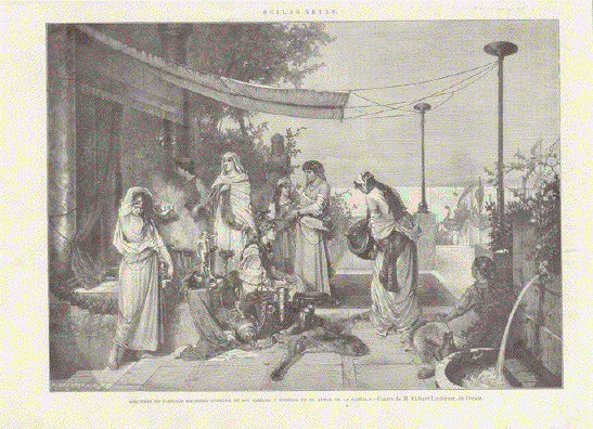 "Traenkstelle am See von Tunis" ( Well for drinking near lake of Tunis.) Wood engraving 1875. Reverse side is printed. 7.5 x 18.2 cm ( 2.9 x 7.1 ") $ 25.00 Order Nr. TUNISIA238001 |