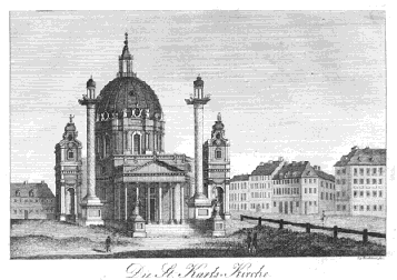 "Church of St. Charles Borromeo, Vienna." Wood engraving ca 1875. 17.8 x 15.8 cm ( 7 x 6.2 ") $ 20.00 Order Nr. VIENNA3866 |