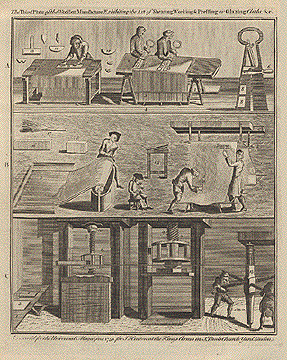 The Third Plate of the Woolen Manufacture Exhibiting the Art of Shearing, Working and Pressing or Glazing Cloths. Copper engraving for "Universal