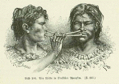 "Wie Wilde in Brasilien schnupfen" Wood engraving showing two