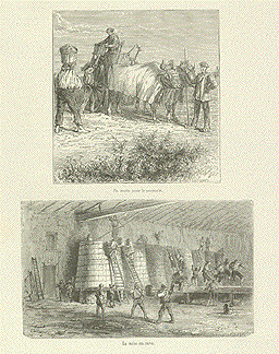 "Fabrication du vin chez les Kirghiz" Wood engravng showing the two